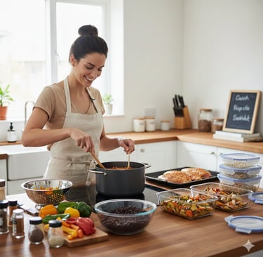 Learn how Batch Cooking serves as your secret weapon for reducing daily decision fatigue and saving time. Utilize your Sunday: Plan & Prep time to cook grains, wash greens, and chop vegetables, making weekday cooking much easier.